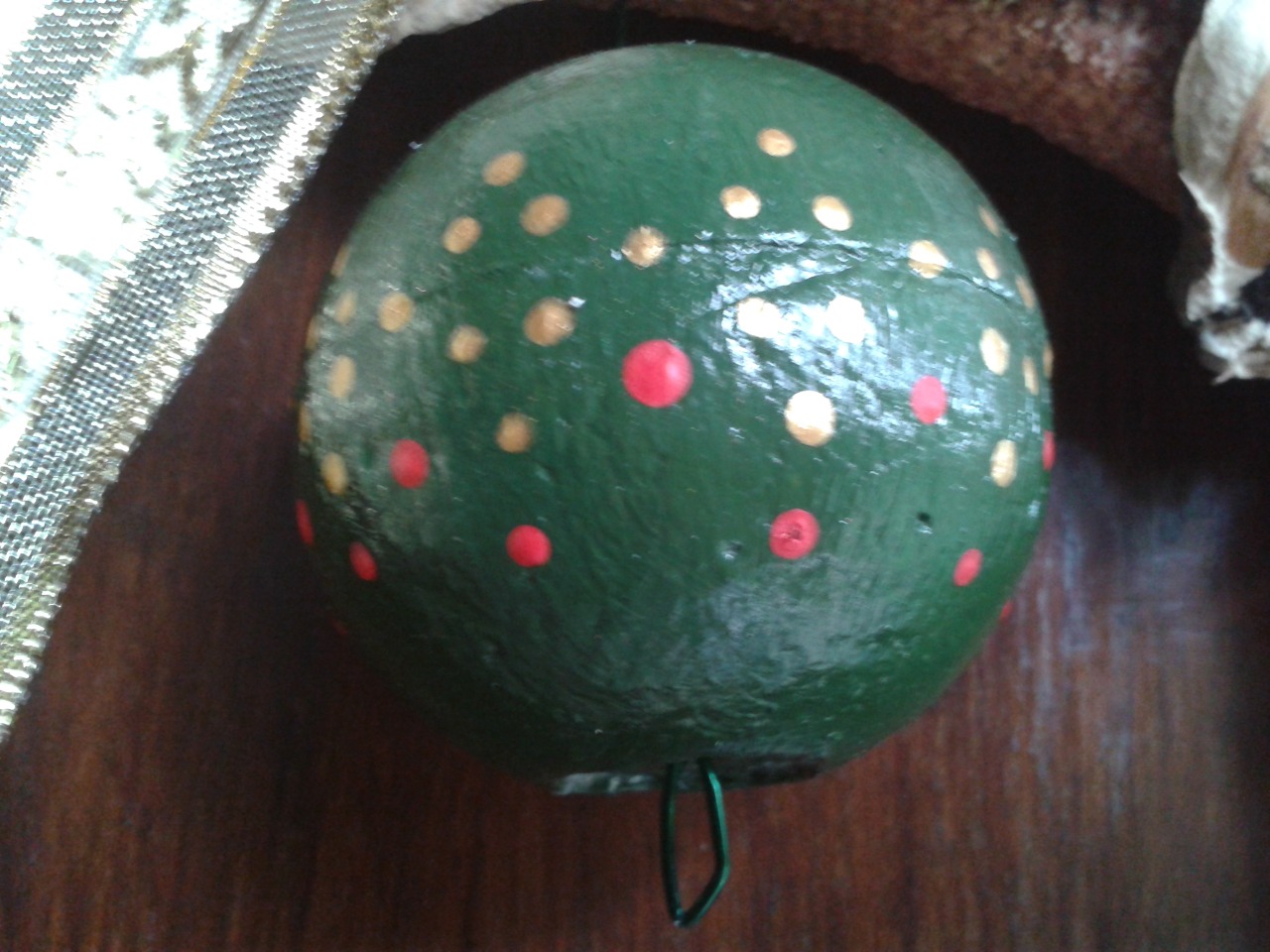 Esta es la esfera de telgopor mediana pintada de acrílico verde con un sencillo diseño de puntos rojos y dorados.