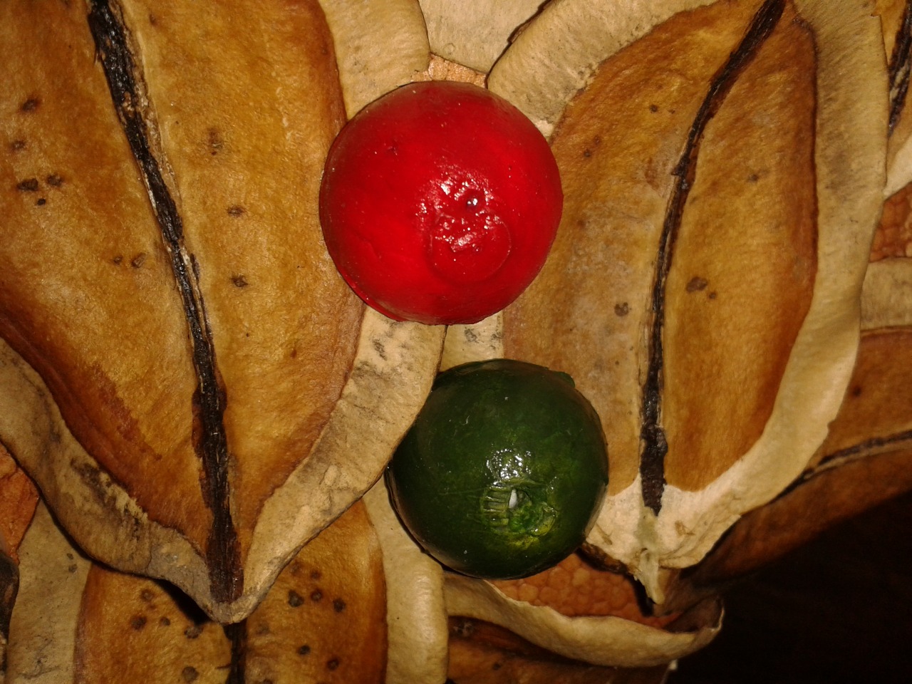 Estas son las medias esferas que fueron pintadas de rojo o verde y colocadas de manera dispersa por la rosca.