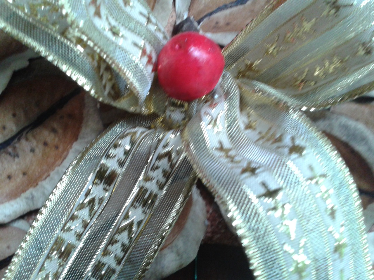 Este es el moño dorado colocado en la parte superior de la rosca y en el centro tiene una media esfera pequeña pintada de rojo.